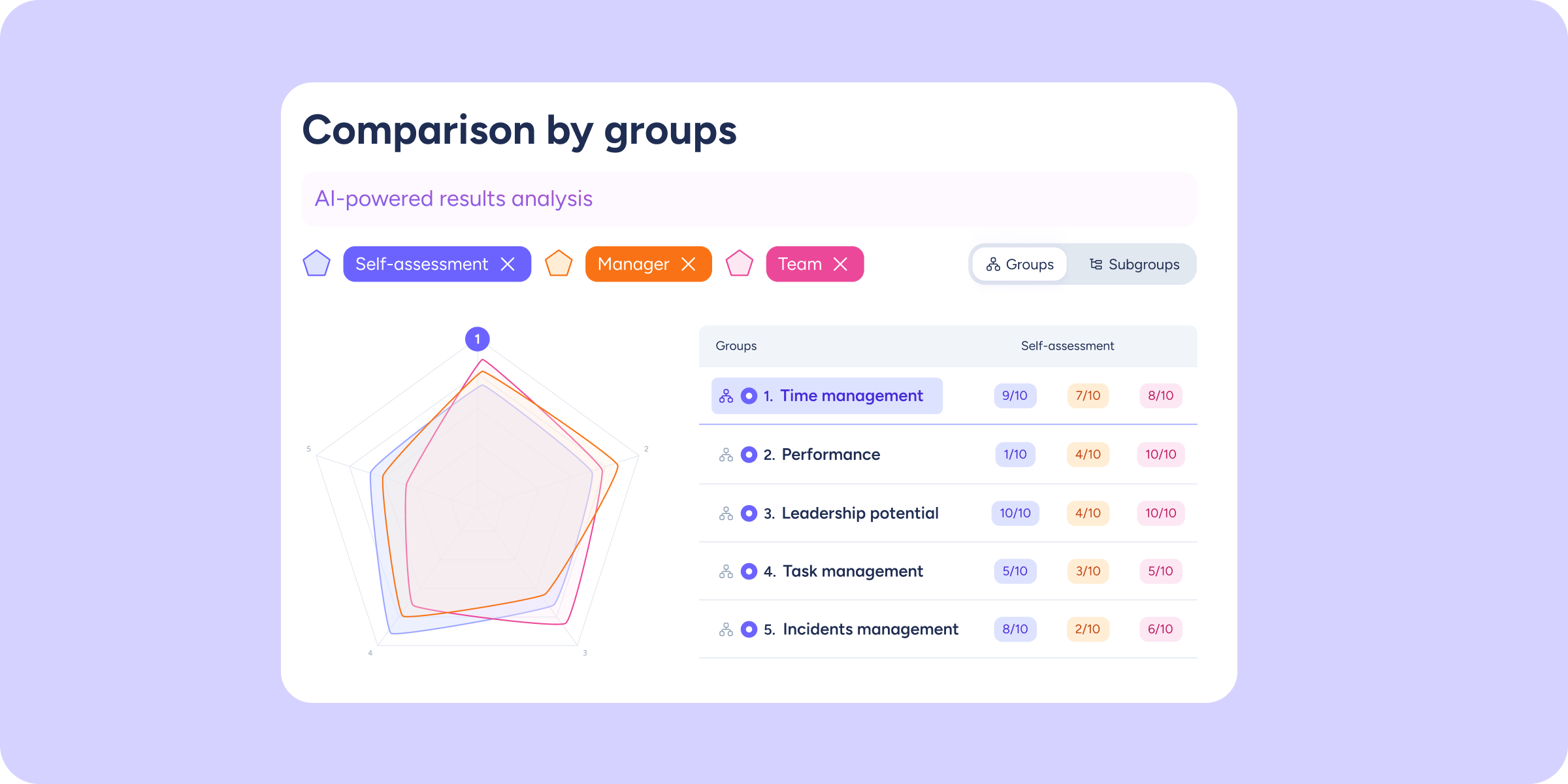 - Spider Chart: each axis represents a question group or subgroup. The shaded area reflects average scores, letting you instantly identify which areas are most developed and which need attention.