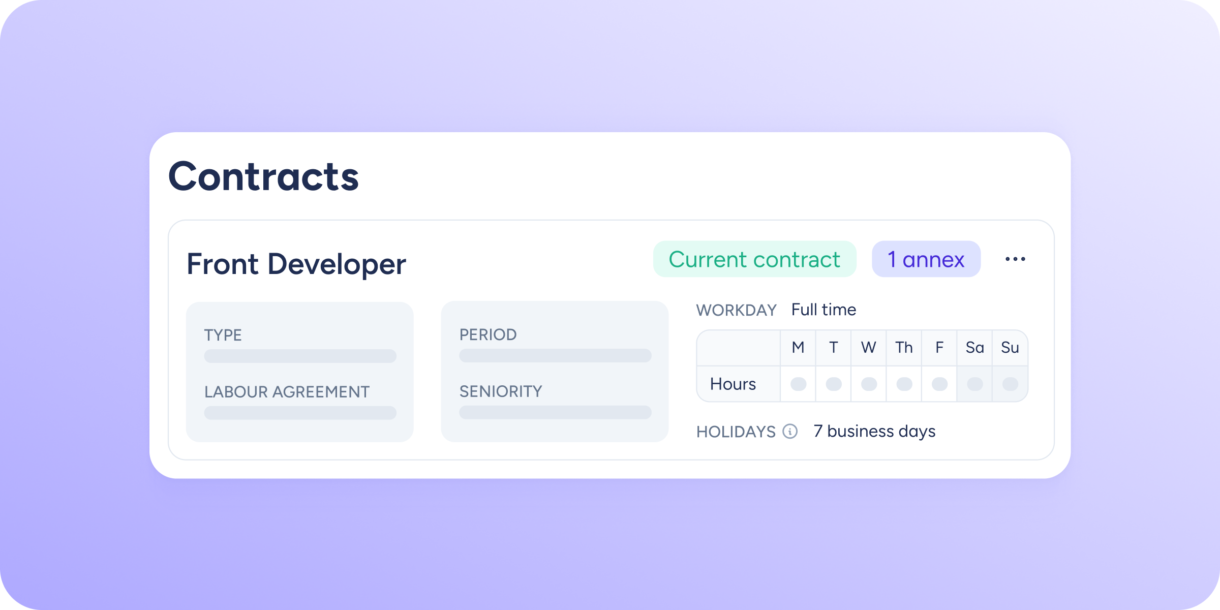 - Update key contract details. Modify important information such as the contract end date, seniority date, job position, or working time conditions.