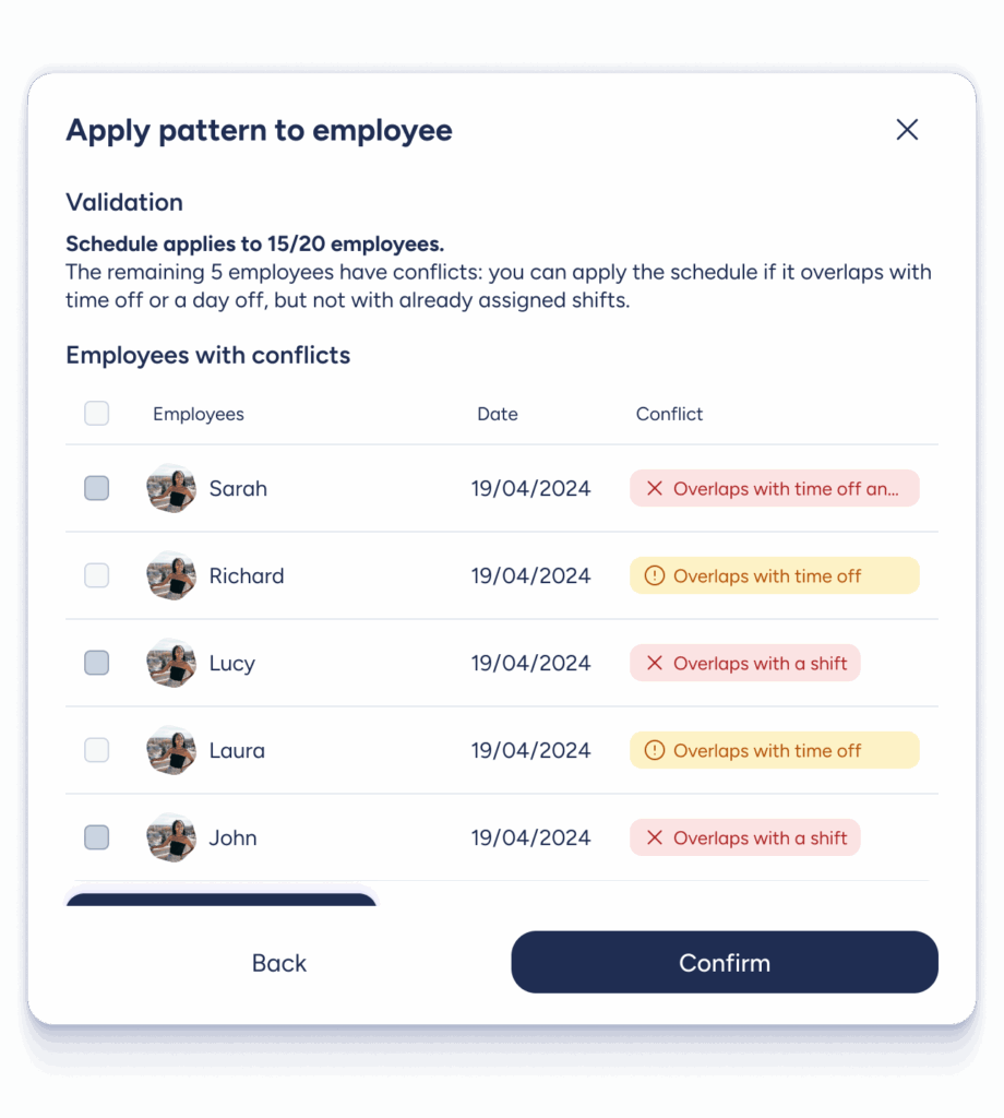 When do these alerts appear? You’ll see them at the exact moment you try to assign the shift. They also include detailed information such as: