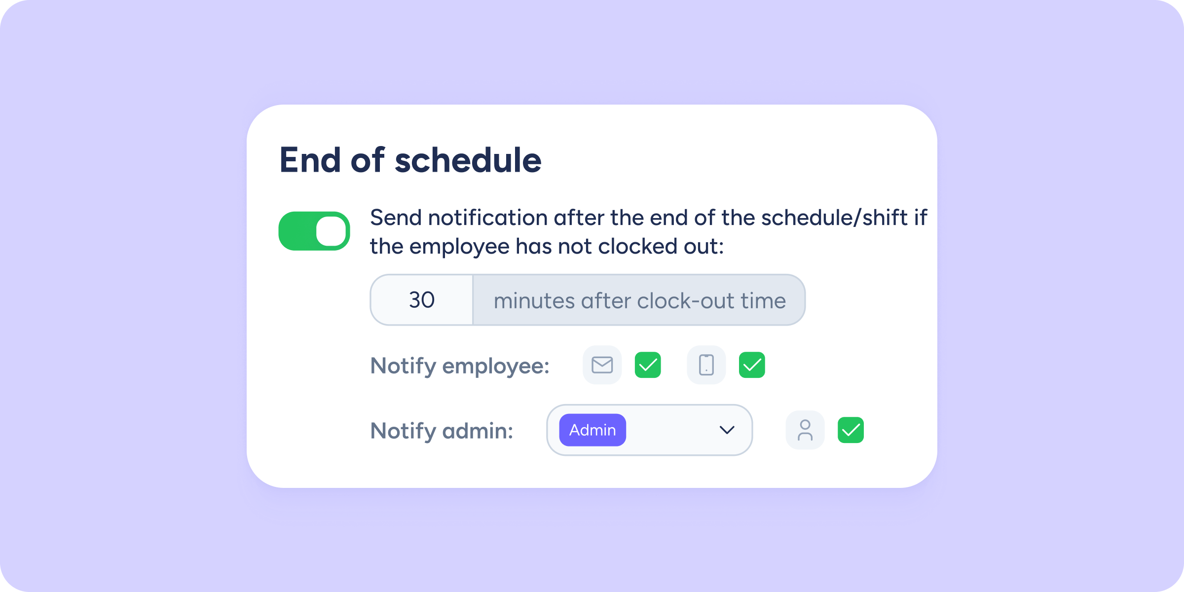 Until now, you could set up an alert if someone forgot to clock in. Now, you can receive notifications that cover the entire workday, such as: