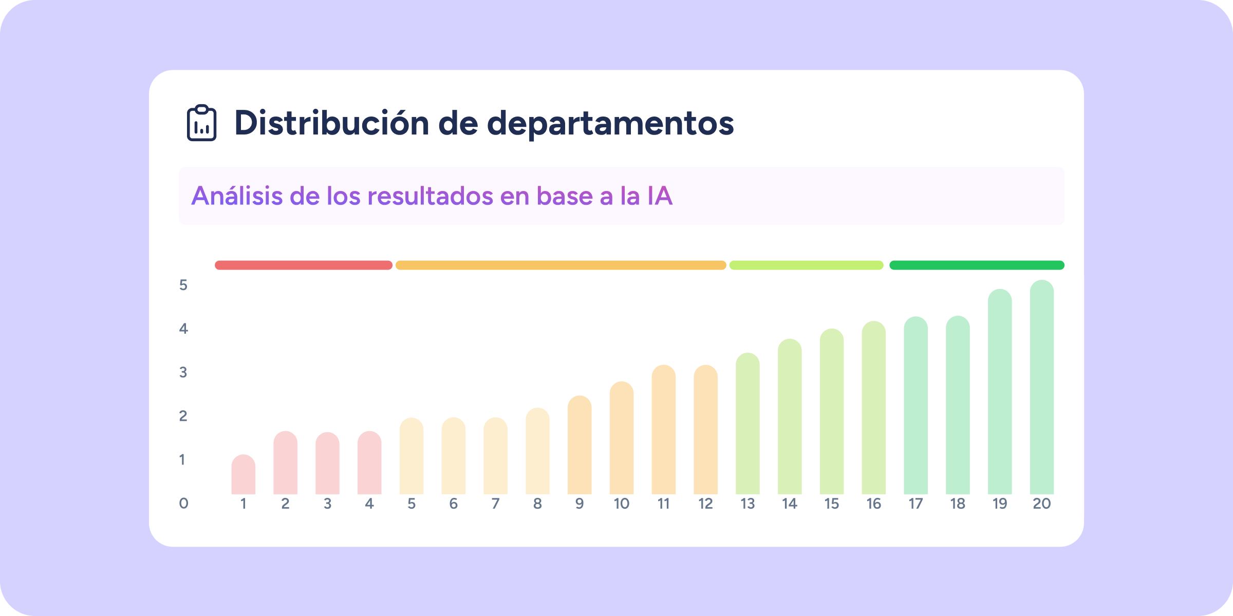 - Ranking por prioridades (de menor a mayor): Las barras aparecen ordenadas por defecto de peor a mejor puntuación, permitiéndote identificar qué departamento, centro o grupo organizativo requiere una intervención prioritaria.