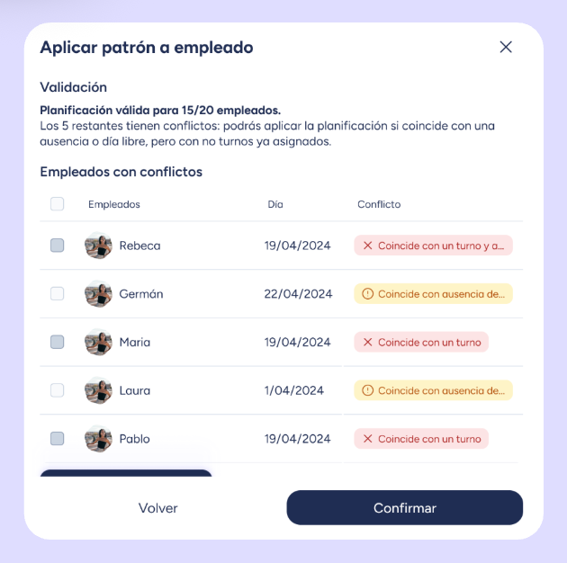 Ahora, cuando asignes un turno (ya sea personalizado, de plantilla, por patrones o por periodicidad), el sistema te alertará en caso de detectar un solapamiento con: