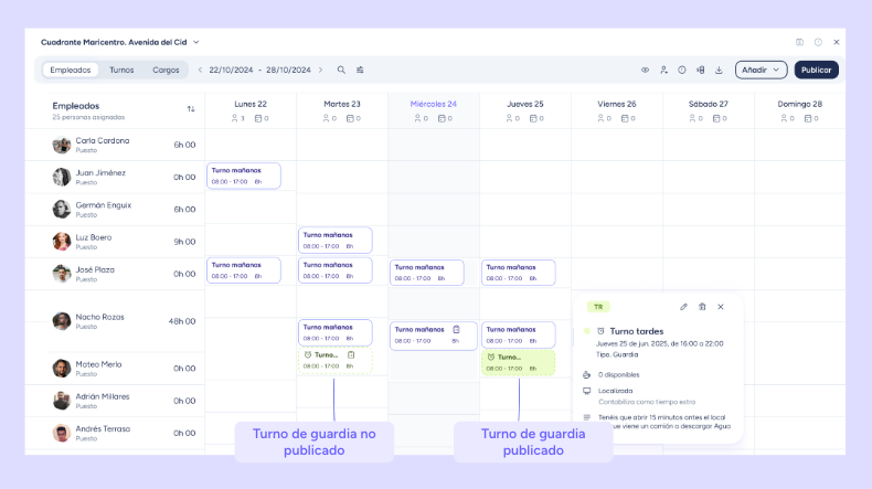 Una vez creado, el turno de guardia aparecerá en el cuadrante con un recuadro de línea de puntos y un icono de reloj junto al nombre para que puedas identificarlo fácilmente.