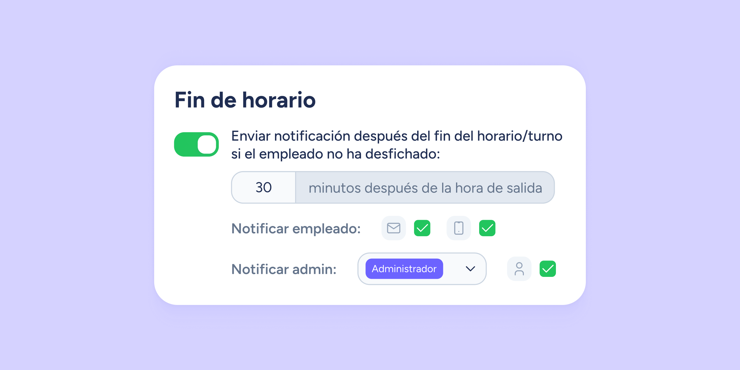 - Elige que le llegue un recordatorio al empleado para que corrija el olvido al instante, y un aviso para ti, para que tengas visibilidad total de lo que ocurre.