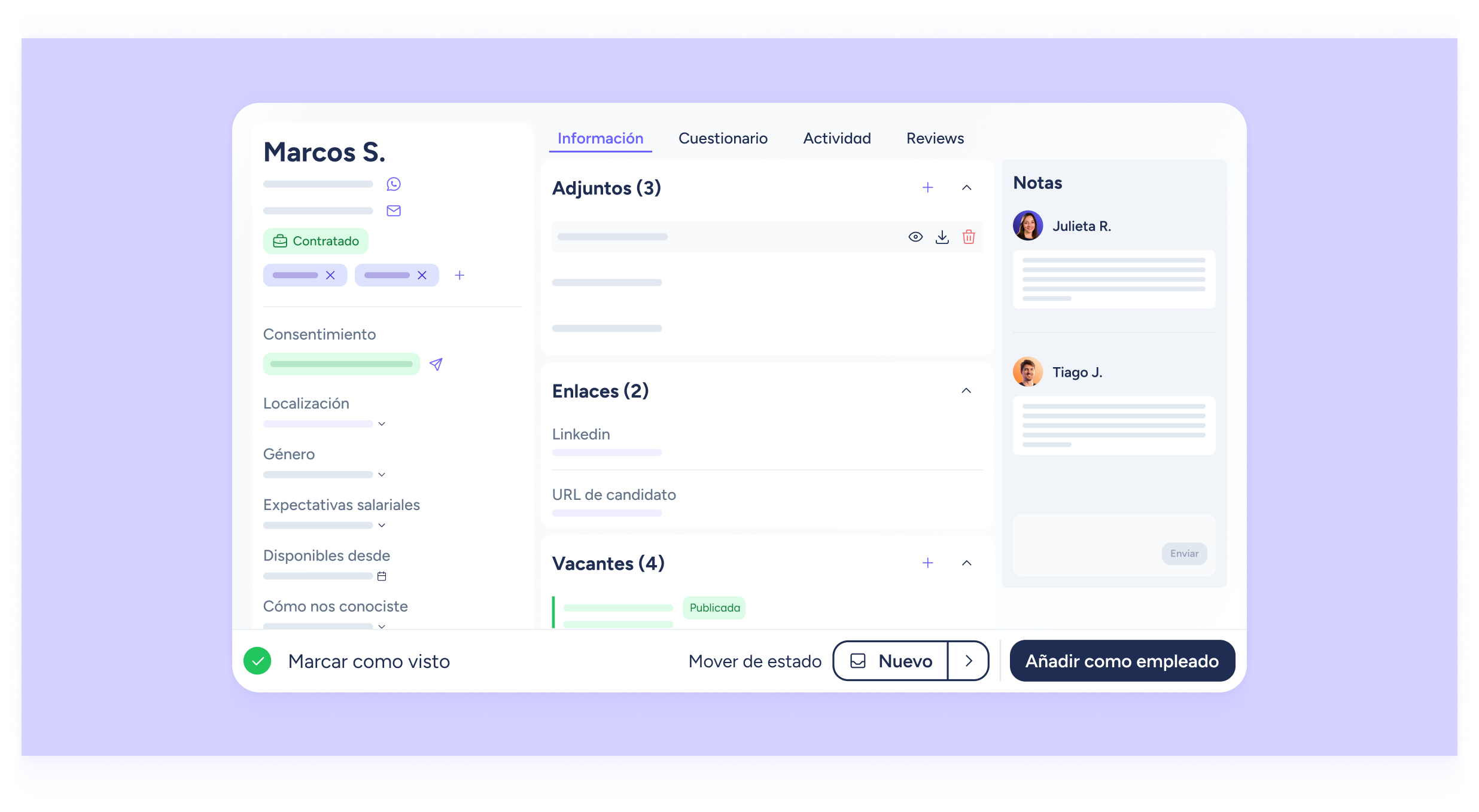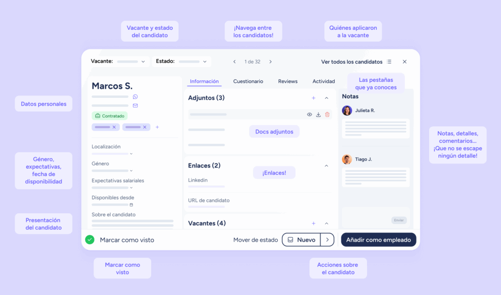 Que permanecerán visibles en todo momento para que no se te escape ningún detalle importante. Deja comentarios útiles que puedan ayudarte en el futuro o ser de ayuda para otros reclutadores del equipo.