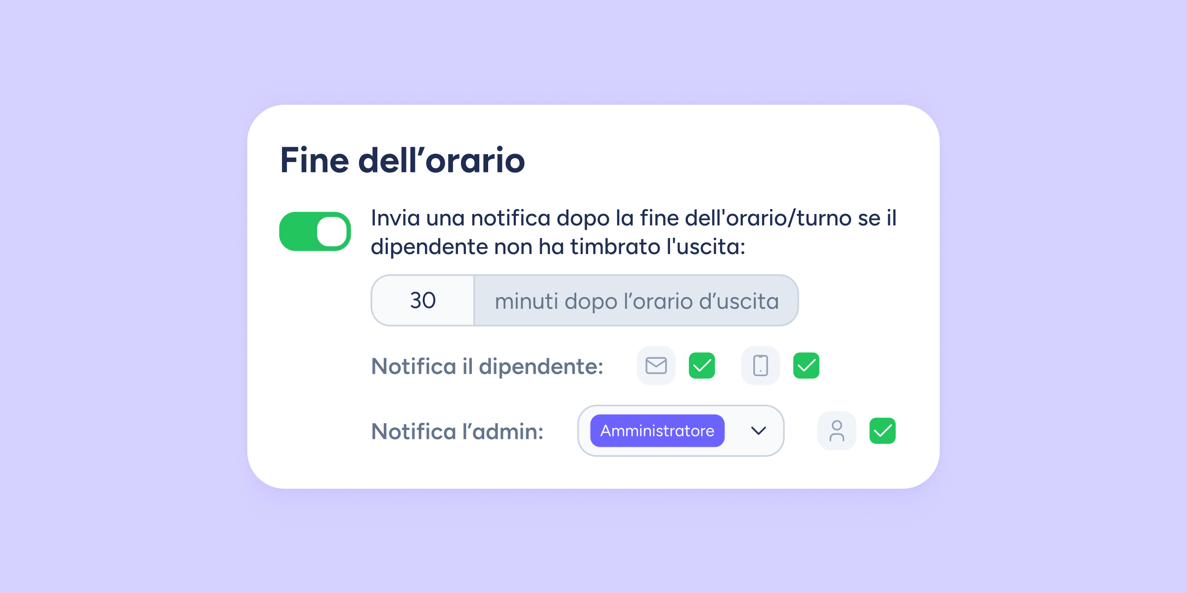 Fino ad ora, potevi configurare un’allerta se qualcuno dimenticava di timbrare. Da ora, invece, potrai ricevere una notifica per coprire tutta la giornata lavorativa, come: