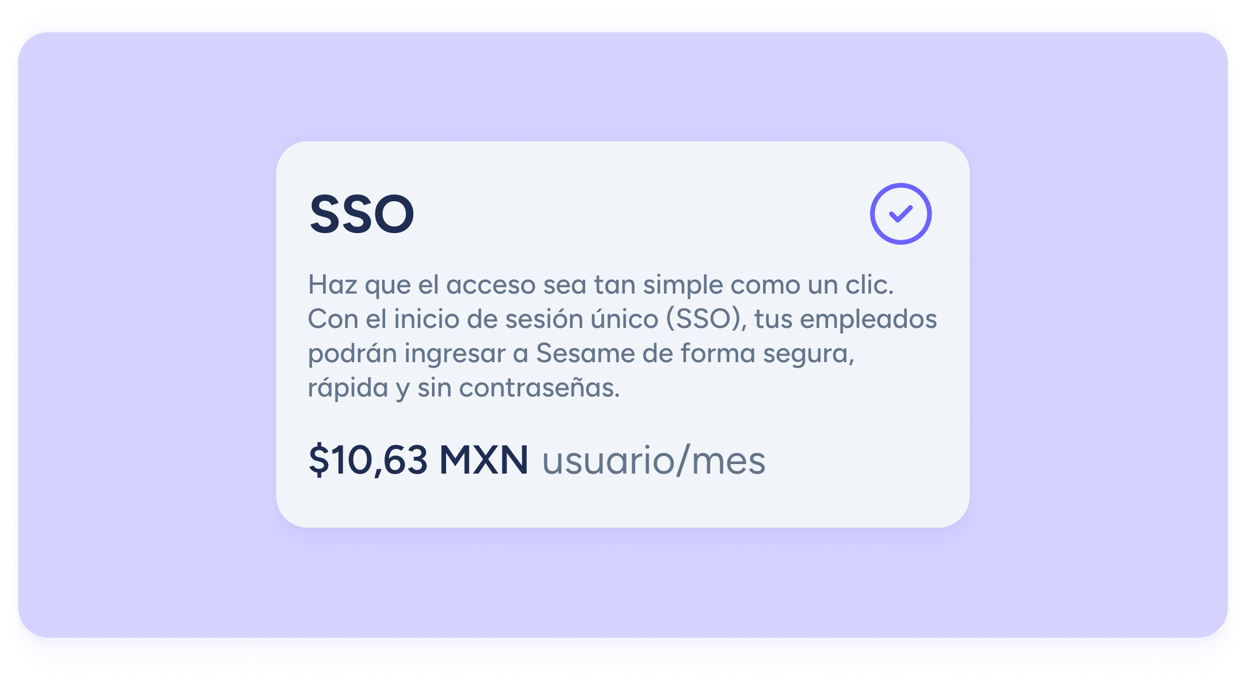 Muy fácil. Como con todos los add-ons de Sesame, solo tienes que ir a la sección de Planes y Precios, seleccionar la tarjeta de SSO y comenzar el proceso. Puedes activar esta funcionalidad por tan solo $10,63 MXN por usuario/mes.