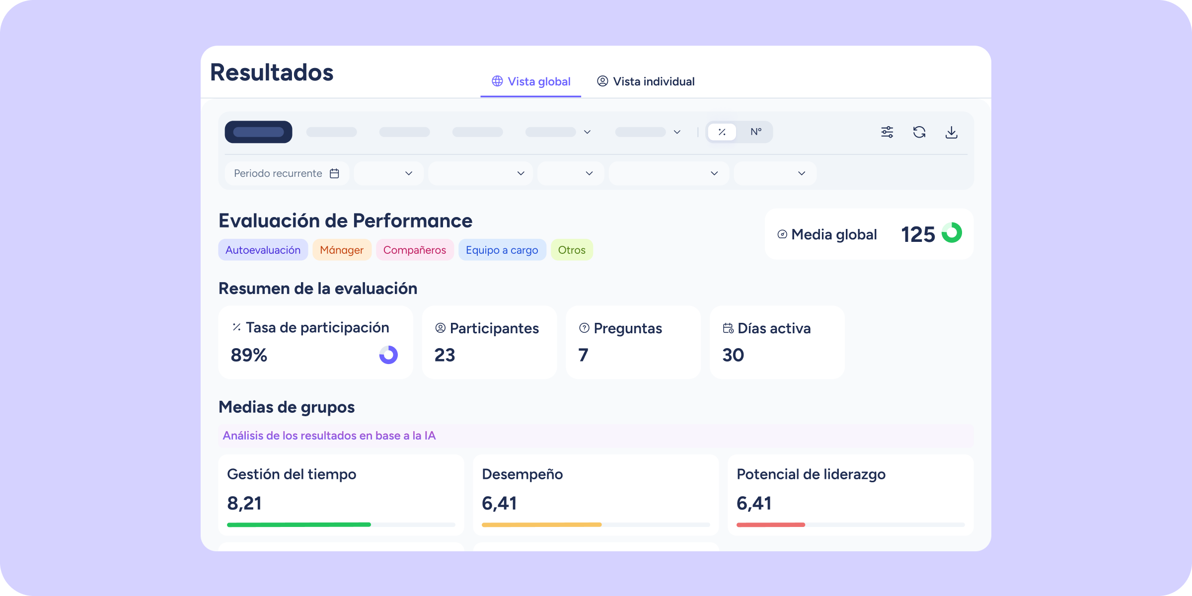 • Filtros globales: cruza los datos por centro, departamento, grupo o tipo de evaluador.