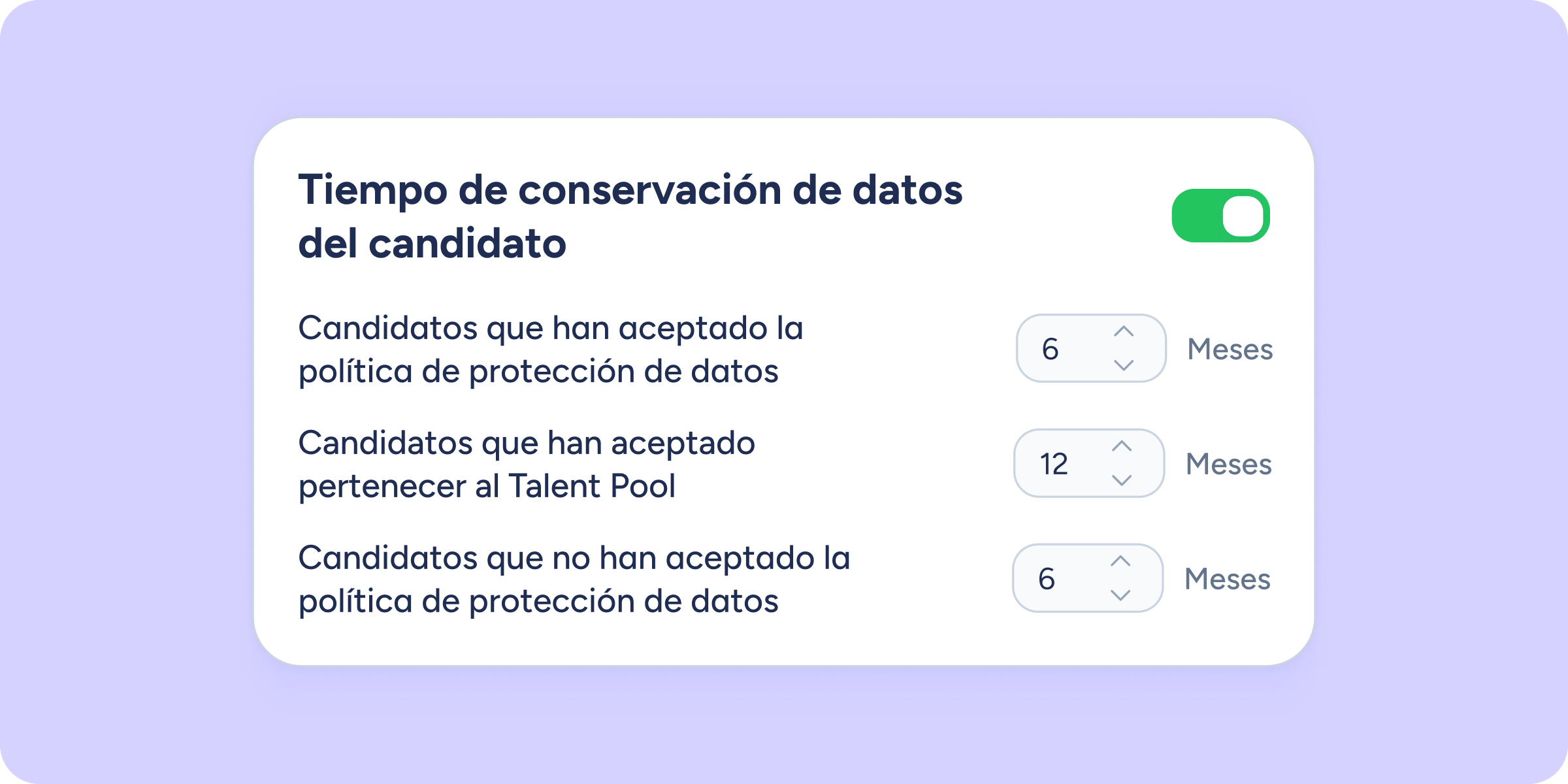 Incorporamos una nueva configuración para ayudarte a gestionar correctamente los datos personales de tus candidatos, asegurando el cumplimiento de las leyes de protección de datos aplicables en tu país o región.