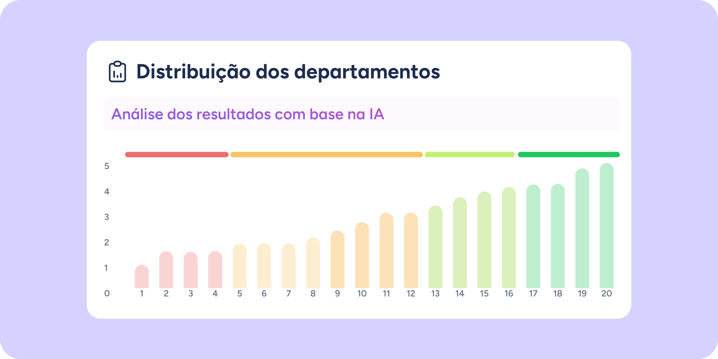 - Ranking por prioridades: as barras são ordenadas automaticamente da menor para a maior pontuação, permitindo identificar quais os departamentos, unidades ou grupos que necessitam de uma intervenção prioritária.