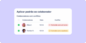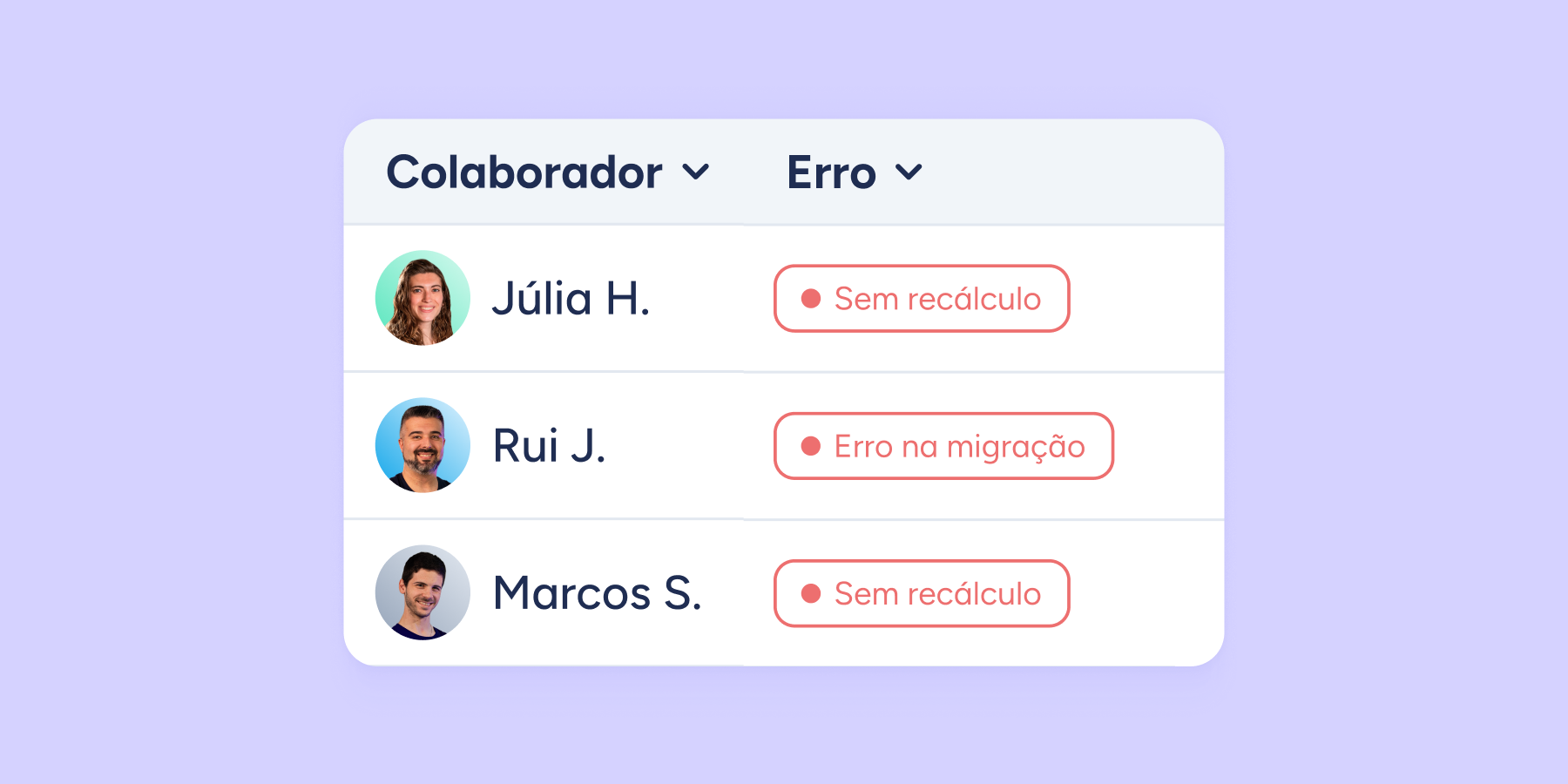 - Diagnóstico de erros: visualize erros específicos, como “Erro na migração de dados” ou “Sem recálculo automático do calendário” (quando o colaborador não tem as suas férias atualizadas segundo o contrato).