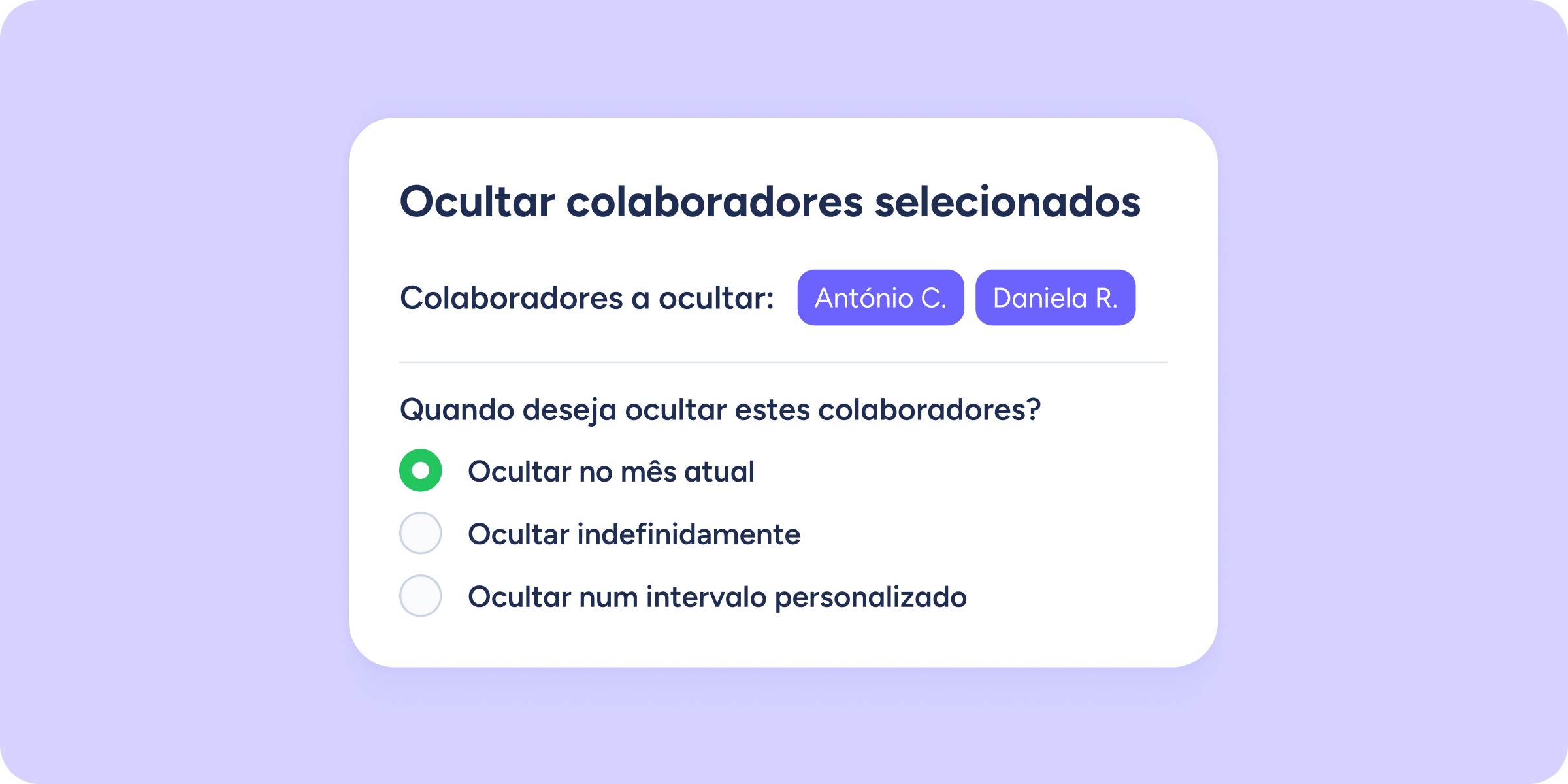Ao selecionar a terceira opção, poderá indicar exatamente o momento de início e de fim do período em que esses colaboradores devem ficar ocultos.